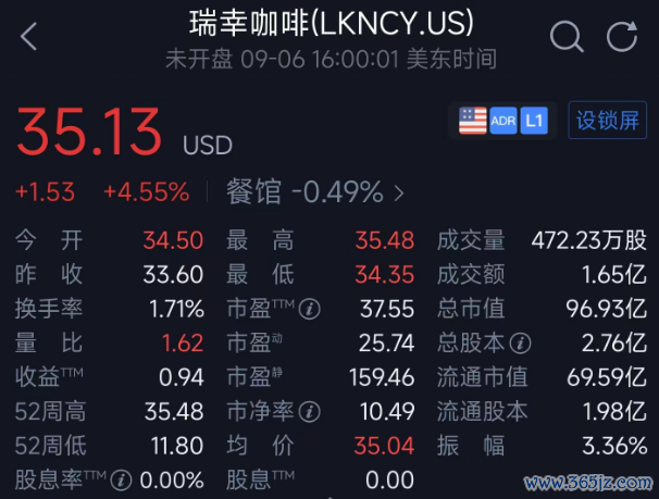 鞭牛士9月7日消息,截至昨日收盘,瑞幸咖啡美股涨近5%,报35.13美元,最高价35.48美元,总市值96.93亿美元,市值一夜涨超30亿元。