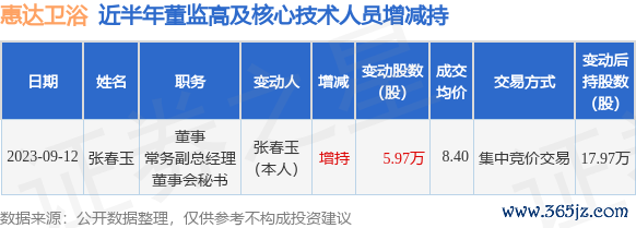 股票配资代理 惠达卫浴: 9月12日公司高管张春玉增持公司股份合计5.97万股