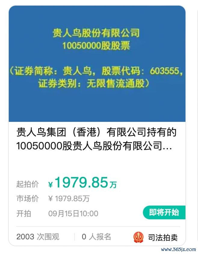 9月7日,记者从阿里拍卖获悉,贵人鸟股份有限公司(股票简称:ST贵人)1005万股股票将于2023年9月15日10时至9月16日10时在福建省泉州市中级人民法院淘宝网司法拍卖平台进行公开拍卖,当前起拍价(展示价)为1979.85万元,具体起拍价以开拍日前20个交易日的收盘价均价乘以拍卖股票总股数。