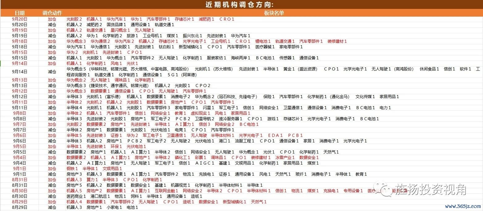 机构资金板块性调仓:9月20日机构净买入超过1000万的个股5只,净卖出超过1000万的个股6只。与前一交易日相比,大盘弱势震荡时,机构席位买盘微幅放大但还在冰点区中,卖盘小幅萎缩,机构资金流出量减少。从板块资金流向上看,主线热点中连续回调的光刻胶被机构中幅买回,华为概念、华为汽车被少量加仓;机器人被少量减仓。非主线热点方面,汽车零部件、存储芯片和CRO被少量加仓,减肥药、国货品牌、轨道交通被少量减仓。
