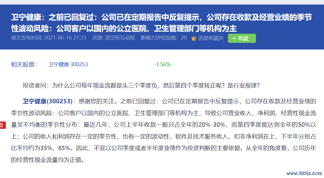 按照卫宁健康2021年回复投资者的说法,公司存在收款及经营业绩的季节性波动风险;上半年收款一般只占全年的20%-30%,而第四季度能达到全年的50%以上。从全年角度看,公司历年经营性现金流量均为正值。