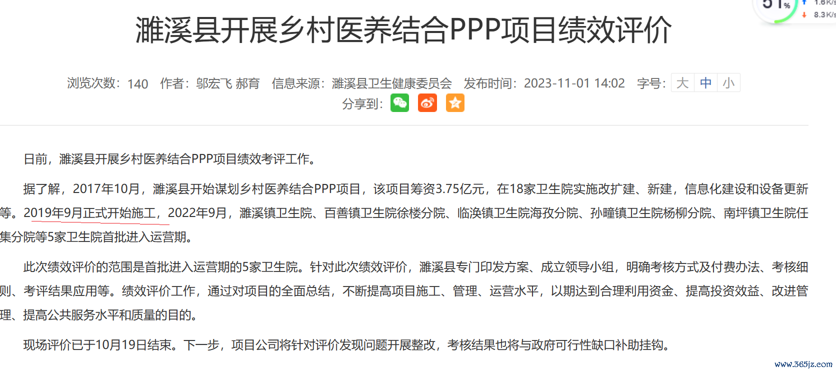 不过据濉溪县卫生健康委员会2023年官方报道,2017年10月,濉溪县开始谋划乡村医养结合PPP项目,该项目筹资3.75亿元。但该则官方报道称,项目是在2019年9月正式施工,这个时间晚于晶奇网络所称该项目的开工时间近一年。