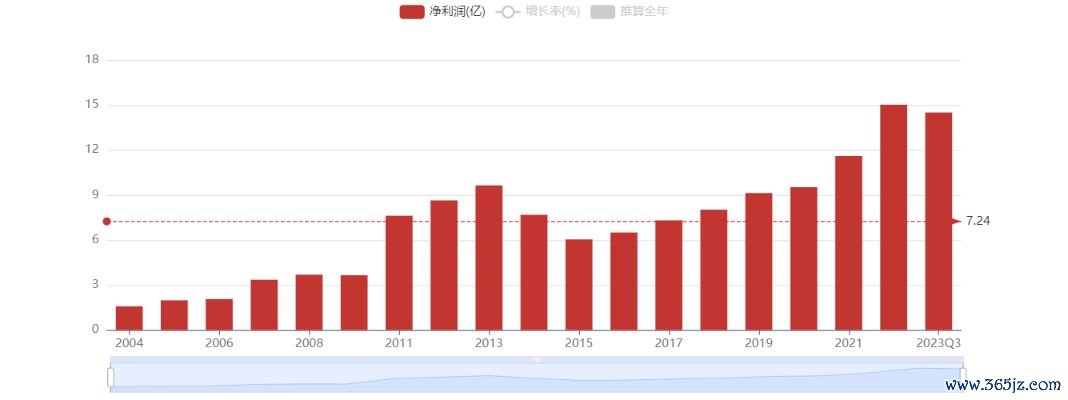 净利润同时期从2004年的1.58亿元增长至2022年的15.02亿元,18年增长8.5倍。2023年前三季度实现净利润14.5亿元,同比增长15.81%。